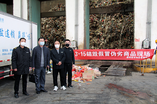 霍邱海創(chuàng)協(xié)助霍邱縣市場(chǎng)監(jiān)督管理局銷毀假冒偽劣商品