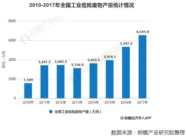 ? ? 近年來,隨著我國經(jīng)濟總量不斷擴大,工業(yè)危險廢物產(chǎn)量也出現(xiàn)明顯增加。2010年全國工業(yè)危險廢物產(chǎn)量已達1589萬噸,2012年全國工業(yè)危險廢物產(chǎn)量增長至3465.2萬噸,2013年有所下降,之后繼續(xù)增長,到了2016年全國工業(yè)危險廢物產(chǎn)量達到5347.3萬噸,較上年同比增長34.49%。截止到2017年全國工業(yè)危險廢物產(chǎn)量達到突破6500萬噸。但有效處理量不足,危險廢物處理水平有待提高。