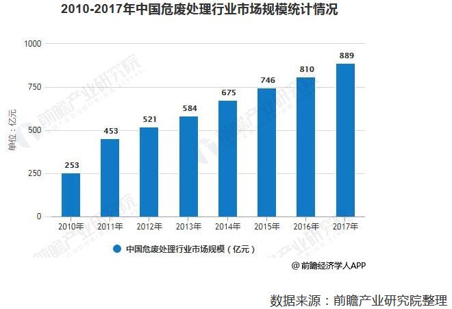 ? ? 我國危廢處理行業(yè)自2001年左右起步,經(jīng)過十多年的發(fā)展,行業(yè)進入快速增長階段,但也存在經(jīng)驗和技術(shù)上的短板。由于我國危廢整體處置率較低,使得行業(yè)市場規(guī)模較小。據(jù)前瞻產(chǎn)業(yè)研究院發(fā)布的《中國危廢處理行業(yè)市場前瞻與投資戰(zhàn)略規(guī)劃分析報告》統(tǒng)計數(shù)據(jù)顯示,2010年中國危廢處理行業(yè)市場規(guī)模僅僅為253億元,2011年中國危廢處理行業(yè)市場規(guī)模增長至453億元。之后一直保持平穩(wěn)增長,到了2016年中國危廢處理行業(yè)市場規(guī)模突破800億元,截止到2017年中國危廢處理行業(yè)市場規(guī)模達到了約889億元。