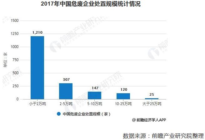 ? ? 正因此,我國危廢處理行業(yè)參與者較多,但企業(yè)規(guī)模普遍較小。根據(jù)2017年7月的數(shù)據(jù)統(tǒng)計,我國危廢處理企業(yè)產(chǎn)能低于2萬噸、2-5萬噸、5-10萬噸、10-25萬噸和25萬噸以上的企業(yè)數(shù)量分別為1210家、307家、147家、120家和25家,67%的企業(yè)危廢處理產(chǎn)能低于2萬噸。