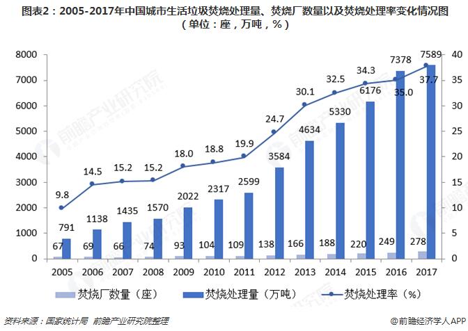 ? ? 和傳統(tǒng)的堆肥、填埋等處理方式相比,焚燒具有處理效率高、占地面積小、對(duì)環(huán)境影響相對(duì)較小等優(yōu)點(diǎn),更能滿足城市生活垃圾處理對(duì)減量化和無害化的要求。并且焚燒處理的方式還能利用焚燒產(chǎn)生的熱能,實(shí)現(xiàn)垃圾的資源化,這些優(yōu)勢(shì)使得垃圾焚燒處理在近些年逐漸得到了較為廣泛的應(yīng)用與推廣。焚燒垃圾場(chǎng)的數(shù)量從2005年的67座增長(zhǎng)到2017年的278座,焚燒垃圾處理量由2005年的791萬噸增長(zhǎng)到2017年的7589萬噸。焚燒處理率由2005年的9.8%上升到2017年的37.7%。