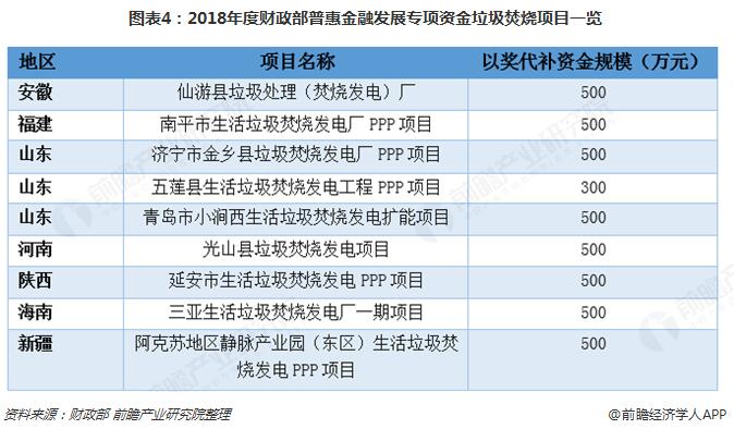 ? ? 2018年10月12日,財(cái)政部發(fā)布《關(guān)于下達(dá)2018年度普惠金融發(fā)展專項(xiàng)資金預(yù)算的通知》,并隨文公布了獲得PPP項(xiàng)目以獎(jiǎng)代補(bǔ)資金項(xiàng)目名單,其中新建項(xiàng)目383個(gè),存量項(xiàng)目11個(gè)。涉及大批流域綜合治理、污水處理廠、生活垃圾焚燒發(fā)電,環(huán)衛(wèi)等環(huán)保領(lǐng)域項(xiàng)目。其中涉及生活垃圾處理的項(xiàng)目有20個(gè),包含9個(gè)垃圾焚燒項(xiàng)目。