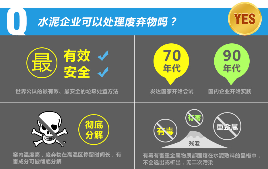 ? ?[核心提示]水泥窯協(xié)同處置廢棄物是世界公認(rèn)的最有效、最安全的垃圾處置方法。上世紀(jì)70年代,發(fā)達(dá)國(guó)家開始嘗試; 90年代國(guó)內(nèi)企業(yè)開始實(shí)踐。在水泥生產(chǎn)過(guò)程中,利用窯內(nèi)高溫,廢棄物在高溫區(qū)停留時(shí)間長(zhǎng),有害成分可被徹底分解,同時(shí),殘?jiān)械牧?、氯或重金屬等有害物質(zhì)可固熔在熟料的晶格中,無(wú)二次污染。