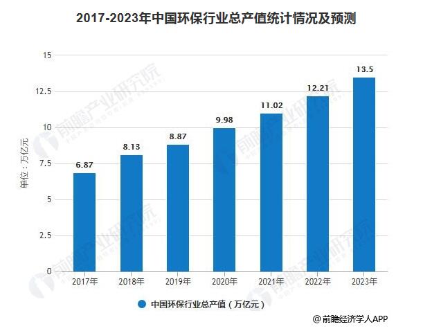 ? ? 據前瞻產業研究院發布的《中國環保行業發展前景與投資預測分析報告》統計數據顯示,截止至2017年中國環保行業總產值達到6.87萬億元,前瞻初步測算2018年中國環保行業總產值將達8.13萬億元左右。預測2019年中國環保行業總產值將達8.87萬億元。未來五年(2019-2023)年均復合增長率約為11.07%,并預測在2023年中國環保行業總產值將接近14萬億元。