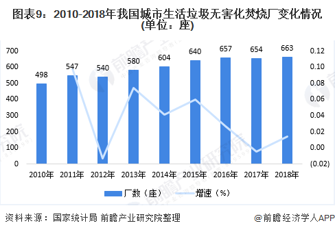從無害化處理企業來看,2010-2018年,我國城市生活垃圾無害化衛生填埋和焚燒廠數呈逐年增加趨勢。2018年,我國城市生活垃圾無害化衛生填埋廠共663座,同比增加9座;無害化城市生活垃圾焚燒場數量為331座,同比增加45座。