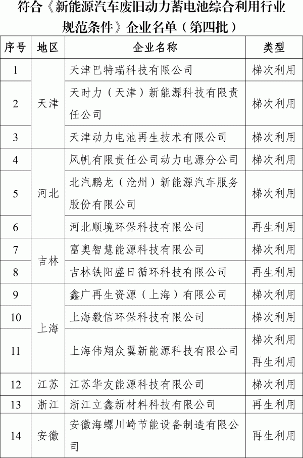 再生利用15家企業,包括河北順境環保科技、吉林鐵陽盛日循環、上海偉翔眾翼新能源、安徽海螺川崎節能、南都華鉑新材、贛州騰遠鈷業、河南科隆電源、駱駝集團資源循環襄陽、湖南天泰天潤新能源等。