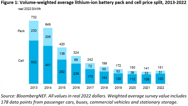 雖然近幾個月來鋰、鎳和鈷等關(guān)鍵電池金屬的價格略有放緩,但BNEF預(yù)計,2023年電池組的平均價格將保持在152美元/KWh的高位(以2022年的實際美元計算)。