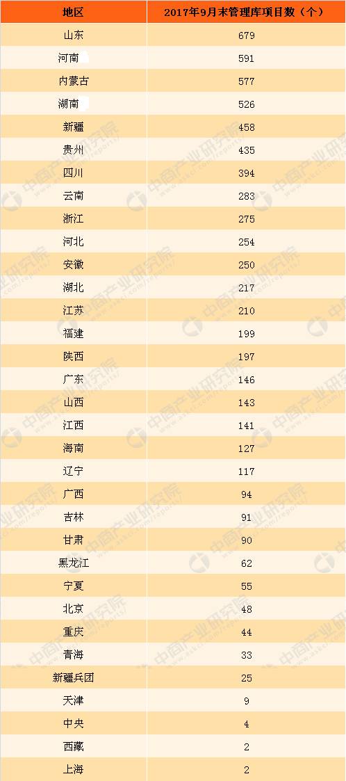 ? ? 截至2017年9月末,全國入庫項目合計14220個、投資額17.8萬億元,包括識別、準(zhǔn)備、采購和執(zhí)行階段項目,無移交階段項目。其中,準(zhǔn)備、采購和執(zhí)行階段項目合計6778個,納入管理庫,總投資10.1萬億元。按PPP管理庫地區(qū)項目數(shù)排序,前三位是山東(含青島)、河南、內(nèi)蒙古,項目數(shù)合計占入庫項目總數(shù)的27.2%;湖南、貴州、云南投資額居前三位,分別為8160億元、7742億元、7468億元,合計占同口徑全國總投資的23.1%。