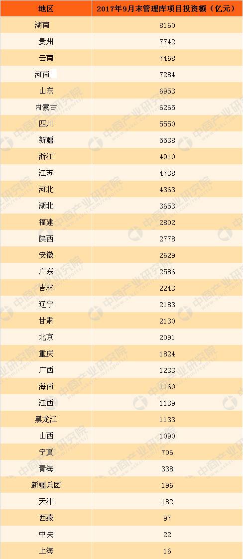 2017年9月末中國各地區(qū)PPP管理庫項目投資金額統(tǒng)計