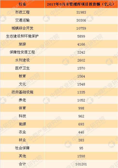 ? ? 截至2017年9月末,中國各行業(yè)PPP管理庫項目投資額達(dá)到10.1萬億元。市政工程、交通運輸、城鎮(zhèn)綜合開發(fā)項目投資額居前三位,分別為31983億元、30306億元和10759億元,合計占同口徑全國總投資額的72.2%。
