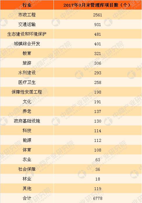 ? ? 截至2017年9月30日,中國各行業(yè)PPP管理庫項目數(shù)達(dá)到6778個。其中,市政工程、交通運輸、生態(tài)建設(shè)和環(huán)境保護(hù)項目數(shù)居前三位,分別為2561個、931個和481個,合計占同口徑全國總數(shù)的58.6%。