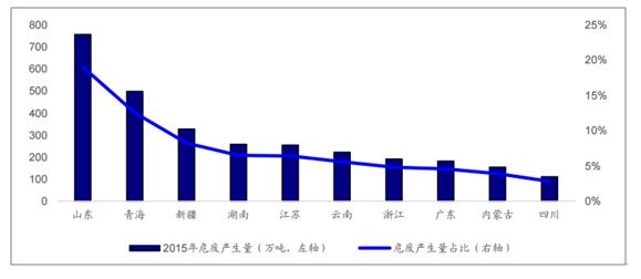 ? ? 危廢跨省運(yùn)輸需要填寫危險廢物轉(zhuǎn)移聯(lián)單,經(jīng)過相關(guān)部門審批,流程較為復(fù)雜,減弱了危廢處理企業(yè)之間的同業(yè)競爭,當(dāng)?shù)匾?guī)模較大的企業(yè)有明顯的地域優(yōu)勢,但同時也不利于危廢企業(yè)的做大做強(qiáng)。根據(jù)環(huán)保部發(fā)布的數(shù)據(jù),工業(yè)危廢產(chǎn)生量排名前十的省(直轄市、自治區(qū))分別是山東、青海、新疆、湖南、江蘇、云南、浙江、廣東、內(nèi)蒙古、四川,合計(jì)占比達(dá)74.5%。東江環(huán)保作為行業(yè)的龍頭企業(yè),按照已獲得的危廢處理資質(zhì)計(jì)算,市占率也僅在3%左右。
