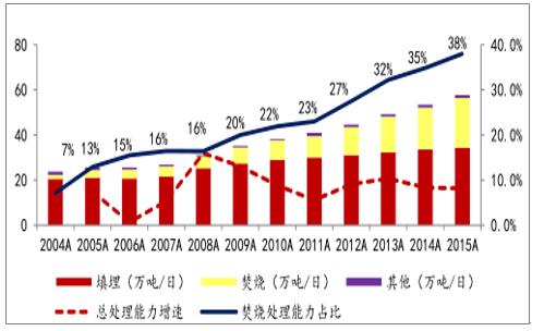 ? ? 2004年以來,我國生活垃圾處理能力穩步提升,其中大部分增量來自于焚燒處理。焚燒處理能力占比由2004年的7%增長至2015年的38%。我國2020年末生活垃圾焚燒處理能力需要從2015年末的23.52萬噸/日增長至59.41萬噸/日。焚燒所占總垃圾處理能力的比例由2015年的31%上升至2020年的54%。假設處理能力每年增量相同,則2016-2020年每年需要增加7.18萬噸/日的垃圾焚燒處理能力。