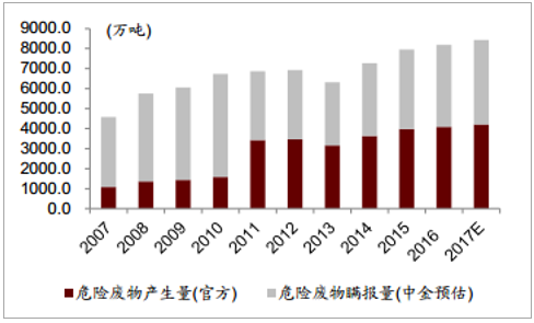? ? 危廢生產(chǎn)量逐年上升,從 2011 年的 3,431.2 萬噸上升到 2015 年的 3,976.1 萬噸,復(fù)合增長(zhǎng)率約為 3%。但是需要注意的是《統(tǒng)計(jì)公報(bào)》采用的是企業(yè)申報(bào)的方法,因此我們認(rèn)為這個(gè)數(shù)據(jù)遠(yuǎn)遠(yuǎn)低于真實(shí)情況。最直接的對(duì)比就是《第一次全國(guó)污染源普查公告》中統(tǒng)計(jì)的 2007 年工業(yè)危廢產(chǎn)生量為4,573.69 萬噸,遠(yuǎn)遠(yuǎn)高于當(dāng)年環(huán)保部公布的 1,079 萬噸。 2011 年,環(huán)保部大幅修改統(tǒng)計(jì)口徑,擴(kuò)大申報(bào)范圍,當(dāng)年《統(tǒng)計(jì)公報(bào)》披露危廢產(chǎn)生量 3,431 萬噸相比 2010 年 1,586萬噸上升一倍有余。即使在這樣的情況下,該數(shù)據(jù)依舊遠(yuǎn)遠(yuǎn)小于《普查公告》數(shù)據(jù)。我們根據(jù)工業(yè)增加值的增長(zhǎng)來估計(jì)實(shí)際危廢產(chǎn)生量, 2007 年工業(yè)增加值約為 11.16 萬億。2016 年工業(yè)增加值上升到 24.79 萬億,復(fù)合增長(zhǎng)率約為 9.26%。如果考慮到企業(yè)減排和循環(huán)利用的因素,我們適當(dāng)調(diào)低危廢產(chǎn)生增速, 2016 年我們預(yù)期的危廢實(shí)際產(chǎn)生量也達(dá)到了 8100 萬噸。行業(yè)內(nèi)普遍預(yù)期實(shí)際產(chǎn)生量應(yīng)該在 1 億噸/年。