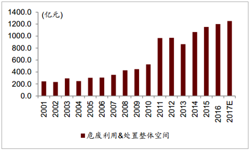 ? ? 我們?nèi)绻凑漳壳耙延械氖袌?chǎng)存量來計(jì)算, 然后按照綜合處臵費(fèi)用 1500 元/噸,無害化處臵 3500 元/噸, 貯存填埋 300 元/噸,以及綜合利用單位附加值 2000 元/噸來進(jìn)行總的粗略計(jì)算,則 2017 年我國(guó)現(xiàn)有危廢存量空間將達(dá)到 1250 億元以上。 需要注意的是,我們沒有考慮到瞞報(bào)漏報(bào)的數(shù)量,如果考慮進(jìn)約 4000 萬噸每年的官方未統(tǒng)計(jì)數(shù)量, 實(shí)際需求空間將超過 2000 億元。