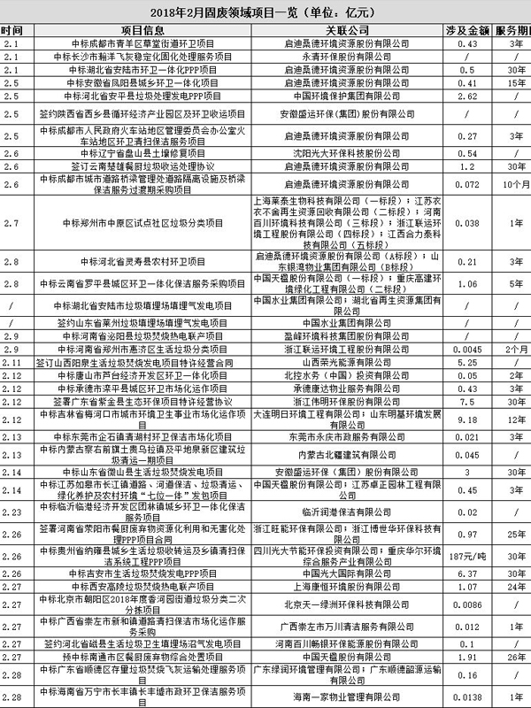 ? ? 據中國固廢網不完全統計,2018年1月固廢領域落地的項目高達55個,涉及總金額逾120億元(詳情請點擊:1月固廢市場盤點:55個項目落定,涉及金額逾120億元)。2018年2月,即使處在春節放假期間,固廢領域落地的項目也足有37個,涉及金額超過43.91億元。其中包括垃圾分類項目3個、垃圾焚燒發電項目7個、環衛項目15個、土壤修復項目1個、餐廚處理項目3個、垃圾清運項目3個、飛灰處理項目2個以及垃圾填埋場項目3個。另外,統計內,本月沒有釋放危廢處理項目。